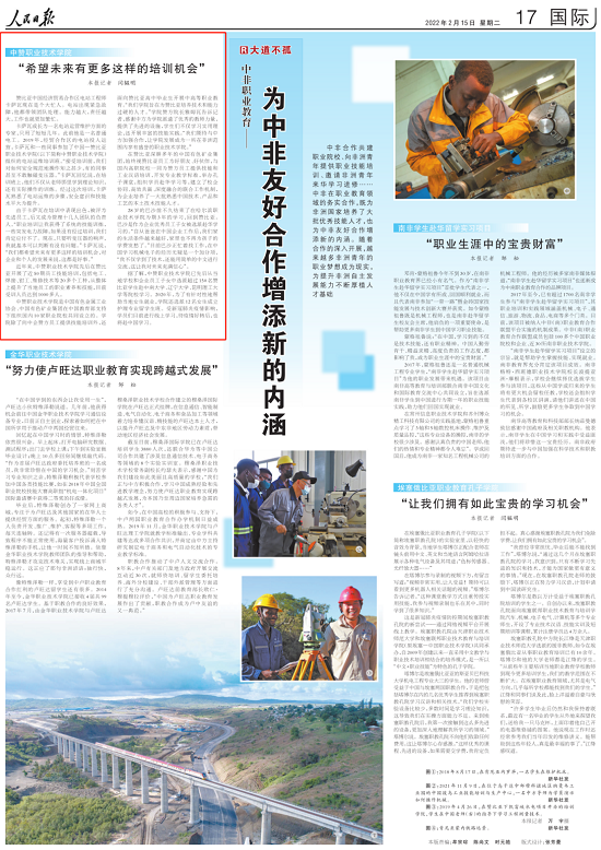 2022Äê2ÔÂ15ÈÕ³öÊéµÄ¡¶ÈËÃñÈÕ±¨¡·¿¯·¢ÌâΪ¡¶ÖзÇÖ°Òµ½ÌÓý——ΪÖзÇÓѺÃÏàÖúÔöÌíеÄÄÚÔÚ£¨´óµÀ²»¹Â£©¡·ÎÄÕ£¬£¬£¬£¬£¬£¬£¬¶ÔÖйúÓÐÉ«¼¯ÍÅÍÆ¶¯ÎÒ¹úÖ°Òµ½ÌÓý¡°×ß³öÈ¥¡±ÇéÐξÙÐÐÁ˱¨µÀ£¨Á´½Ó£ºhttp://paper.people.com.cn/rmrb/html/2022-02/15/nw.D110000renmrb_20220215_1-17.htm£©¡£¡£¡£¡£¡£ÒÔÏÂΪ±¨µÀÈ«ÎÄ£º