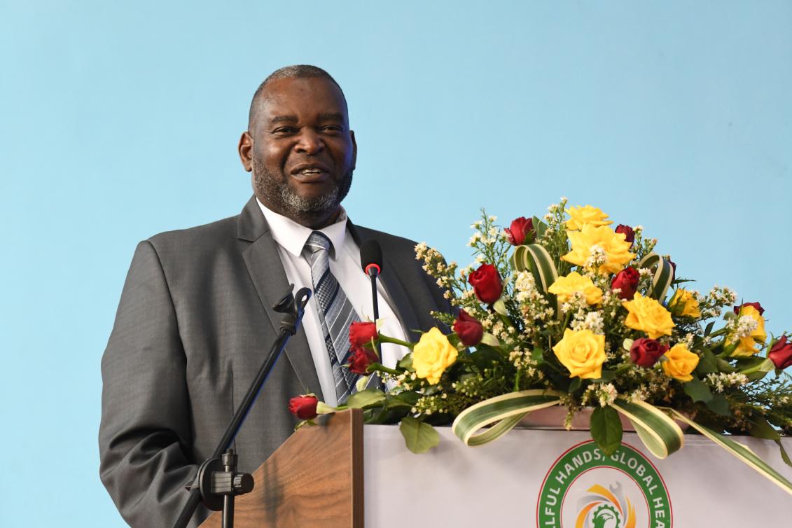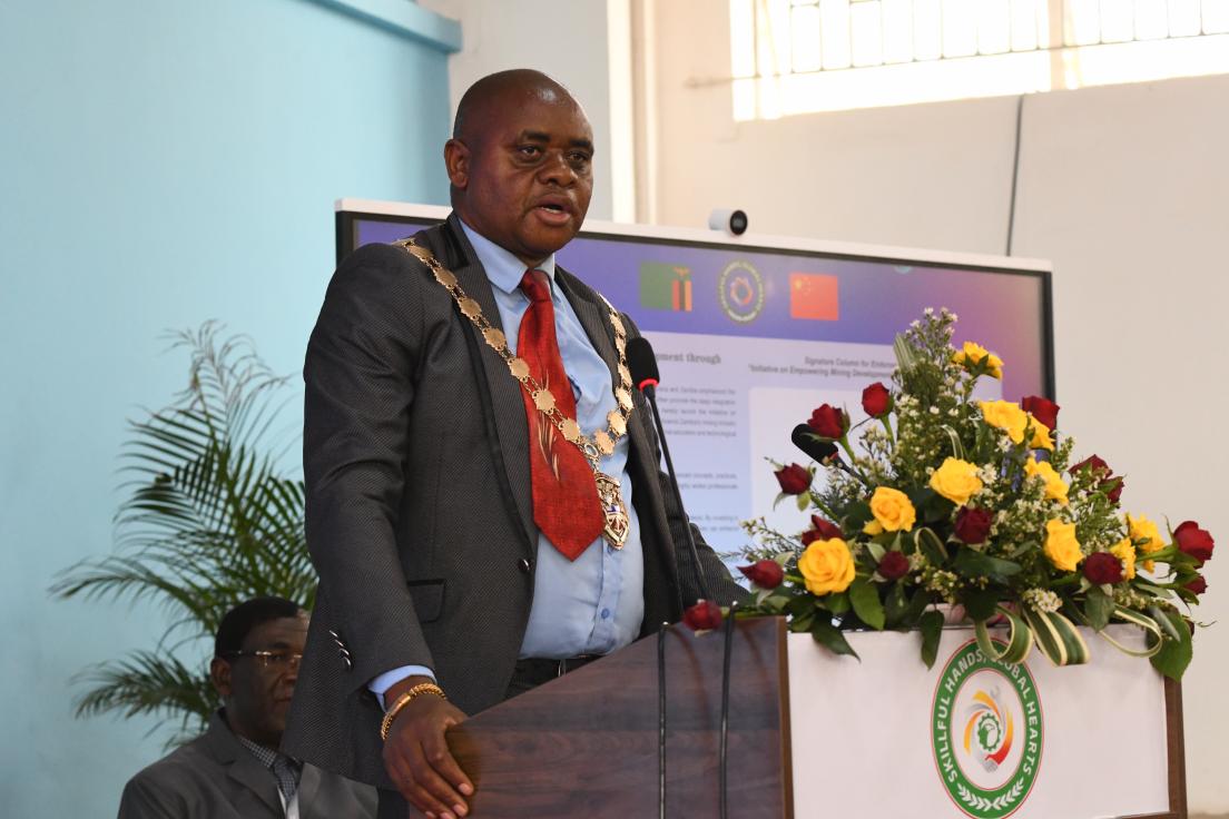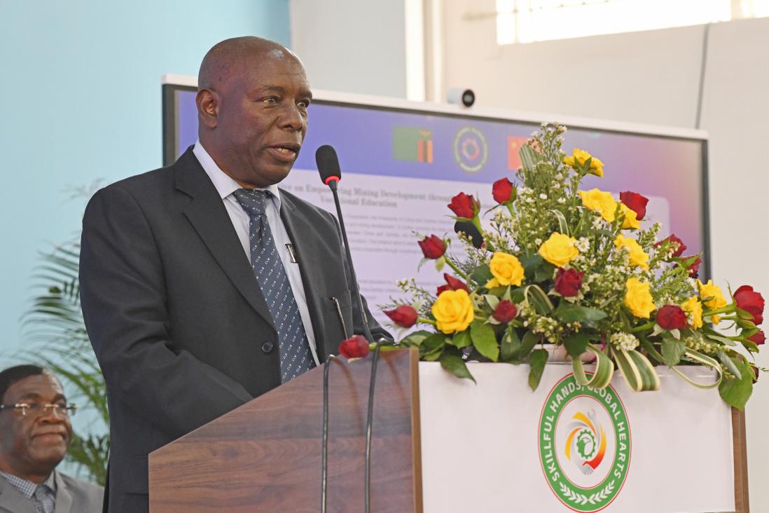 The chairman of the board of directors of ZCCM Investments Holdings Plc. (ZCCM-IH) addresses the opening ceremony of the first Skills Competition for Local Employees of China Nonferrous Metal Mining (Group) Co., Ltd.'s Enterprises in Zambia, held at Sino-Zam Vocational College of Science and Technology in Luanshya, Zambia, Sept. 10, 2025 local time.